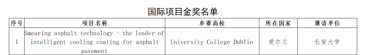 参赛项目“涂沥科技-沥青路面智能降温涂层领航者Smearing asphalt technology- the leader of intelligent cooling coating for asphalt pavement”在2021年第七届中国国际“互联网+”大学生创新创业大赛(The 7thChina International College Students’ “Internet+” Innovation andEntrepreneurshipCompetition)斩获国际项目金奖,实现了长安大学在中国国际“互联网+”大学生创新创业大赛的重大突破。