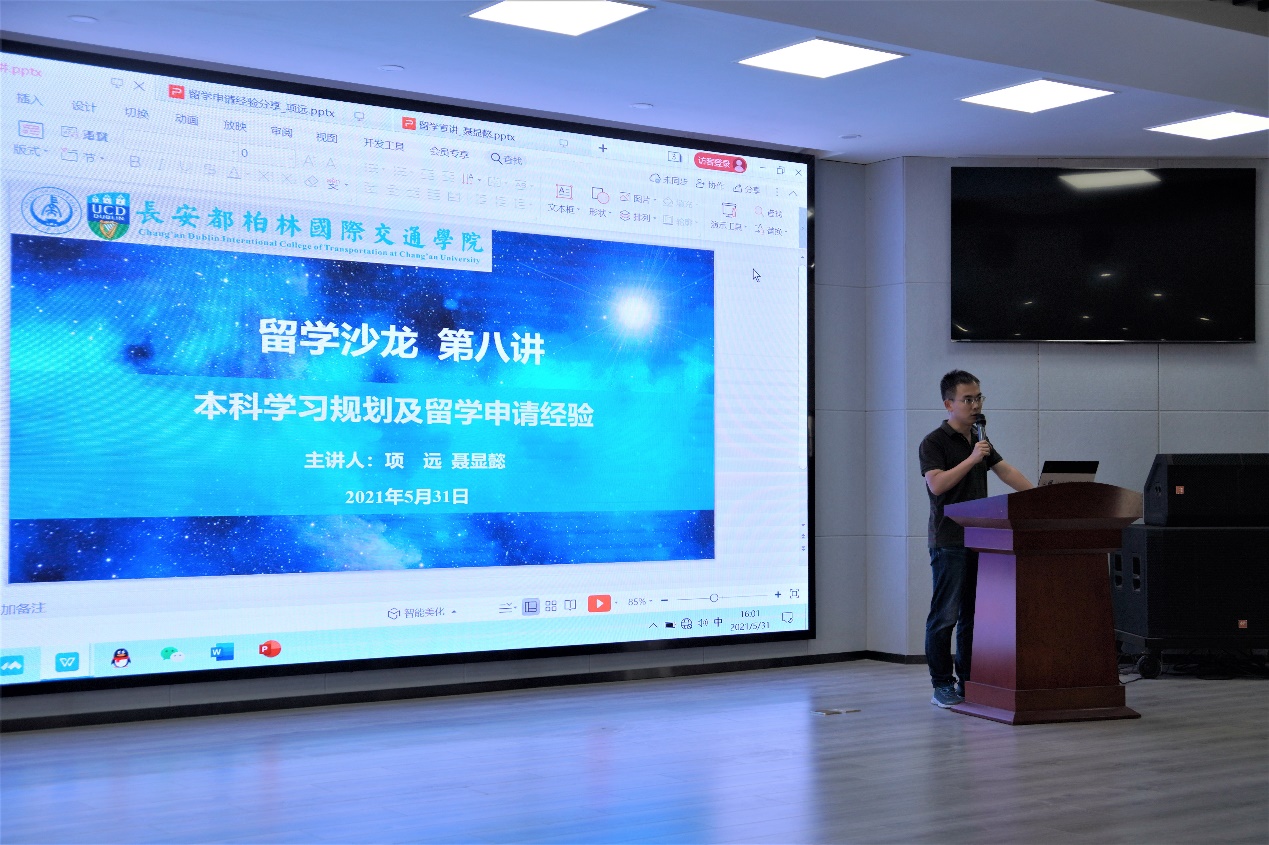 在鸿远教学楼四楼报告厅举办“留学沙龙”第八讲,主题为本科学习规划及留学申请经验。本次活动邀请到2017级道路桥梁与渡河工程(国际班)本科生项远和2017级交通工程(国际班)本科生聂显懿做经验分享。24直播网