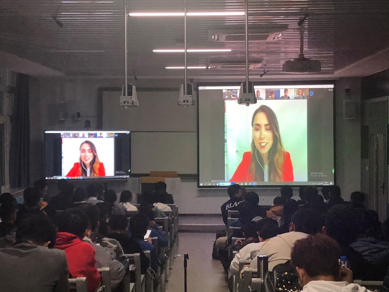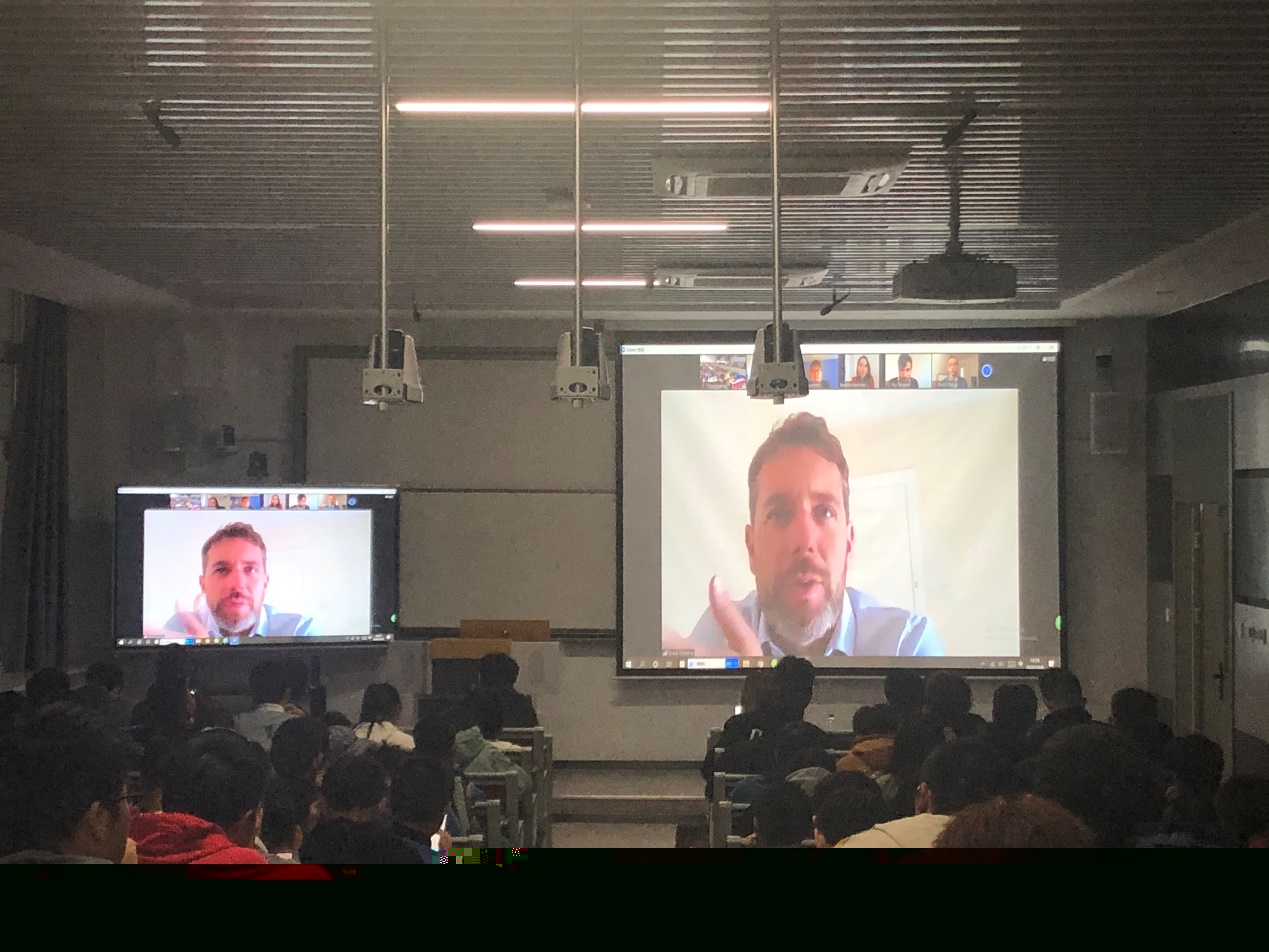 在鸿远教学楼高速网络交互式教室举办中外合作办学2020级新生都柏林大学教授讲专业活动。都柏林大学(UCD)道路桥梁与渡河工程专业负责人Shane Donohue教授、应用语言中心督导Alex Runchman、都柏林大学(UCD)合作办学主管BeiniChen、专业教师Beatriz Martinez Pastor教授、Rui Teixeira 教授以及Budi Zhao教授参加了本次会议。