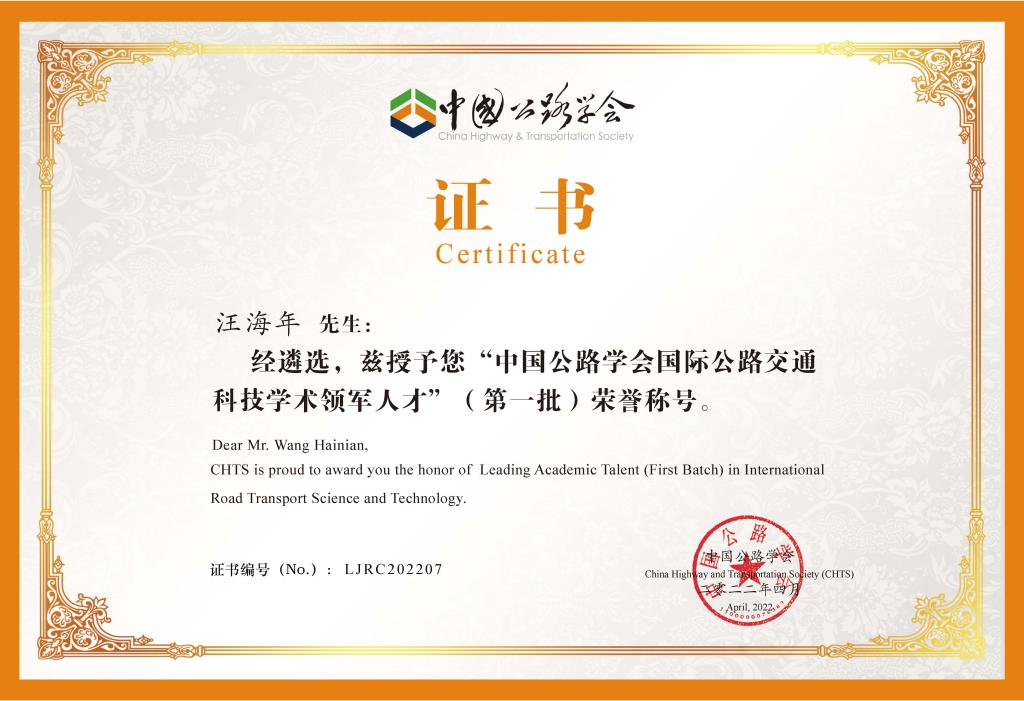 中国公路学会成立于1978年,是我国公路交通行业具有较大影响力和权威性的学术团体,有单位会员2450个,个人会员7.2万名。“国际公路交通科技领军人才”是为深化交通运输综合型国际高端人才培养机制,遴选具有国际公路交通科技话语权的战略性领军人才而设置的人才项目。汪海年教授的入选,对于提升学校国际科技合作水平、推进一流学科建设及深化中外合作办学具有重要意义。