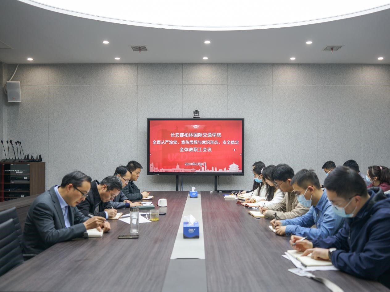 在鸿远教学楼四层会议室召开全体教职工会议,传达学校全面从严治党、宣传思想与意识形态以及安全稳定工作会议精神,并结合24直播网