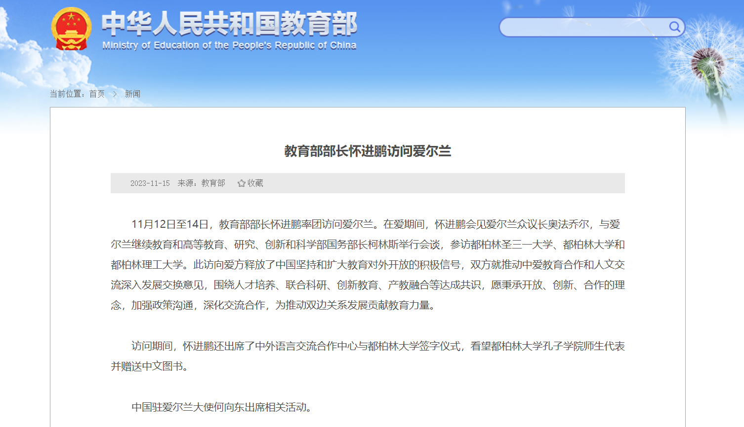 校都柏林大学。新闻报道链接如下://www.moe.gov.cn/jyb_xwfb/gzdt_gzdt/moe_1485/202311/t20231115_1090661.html
