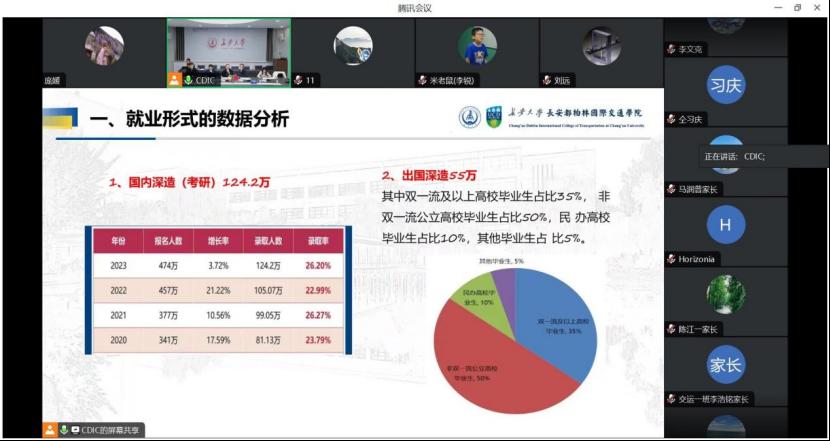 党总支副书记张艳萍以详实的数据向家长和同学们展示了2023年毕业生国内深造、出国深造、考公考编、企业就业等不同就业形式的整体情况,着重分析了2024年大学生总体就业形势及24直播网