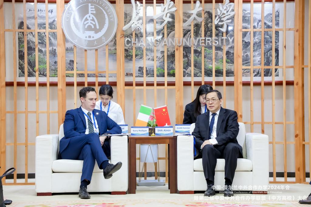 沙爱民对爱尔兰代表团睦百瑞一行的到来表示热烈欢迎,对爱尔兰大使馆及各方机构对长安大学的支持表示感谢。他从学校办学历史、学科建设、学生培养与中爱合作办学情况等进行了简要介绍。他希望长安大学与爱尔兰以中外合作办学为抓手,进一步强化交流合作,为中爱两国高等教育的未来发展探索新方法、开辟新路径、构建新格局,努力成为中爱教育合作交流的典范。