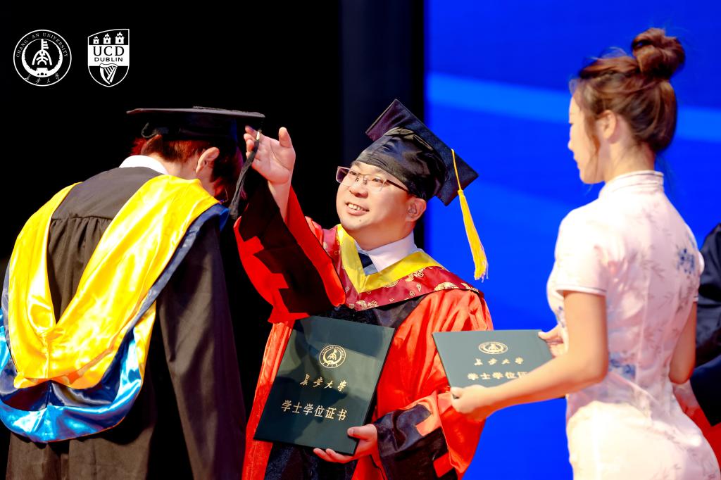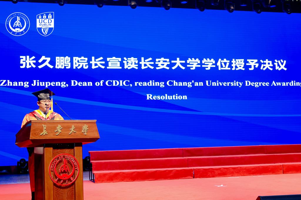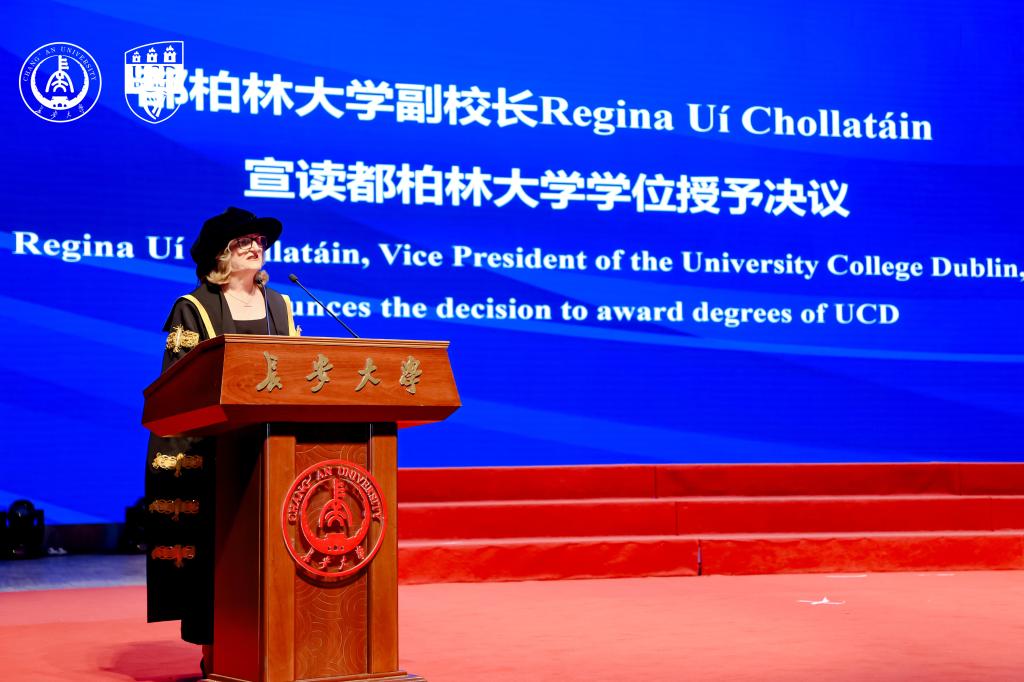在学位授予环节,Regina Uí Chollatáin教授授予都柏林大学学位,张久鹏宣读长安大学学位评定委员会决定并为毕业生拨穗,24直播网