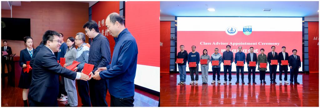 在新生班主任聘任环节,张久鹏为各位班主任颁发聘书,勉励班主任们为同学们提供全方位的精细化教育管理。