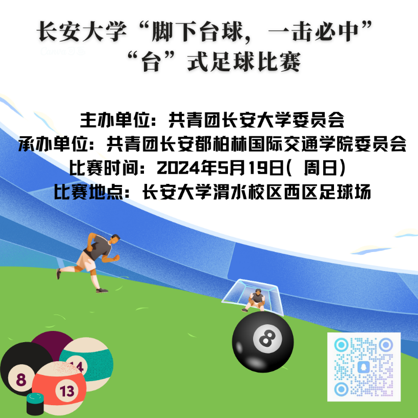 为丰富同学们的课余生活,营造良好的校园文化氛围,挖掘同学们的体育才能,开拓同学们的体育思维,同时促进同学之间的交流与沟通,进一步增强团队精神与拼搏精神,特举办长安大学“脚下台球·一击必中”之“台”式足球趣味比赛。现将相关事宜通知如下: