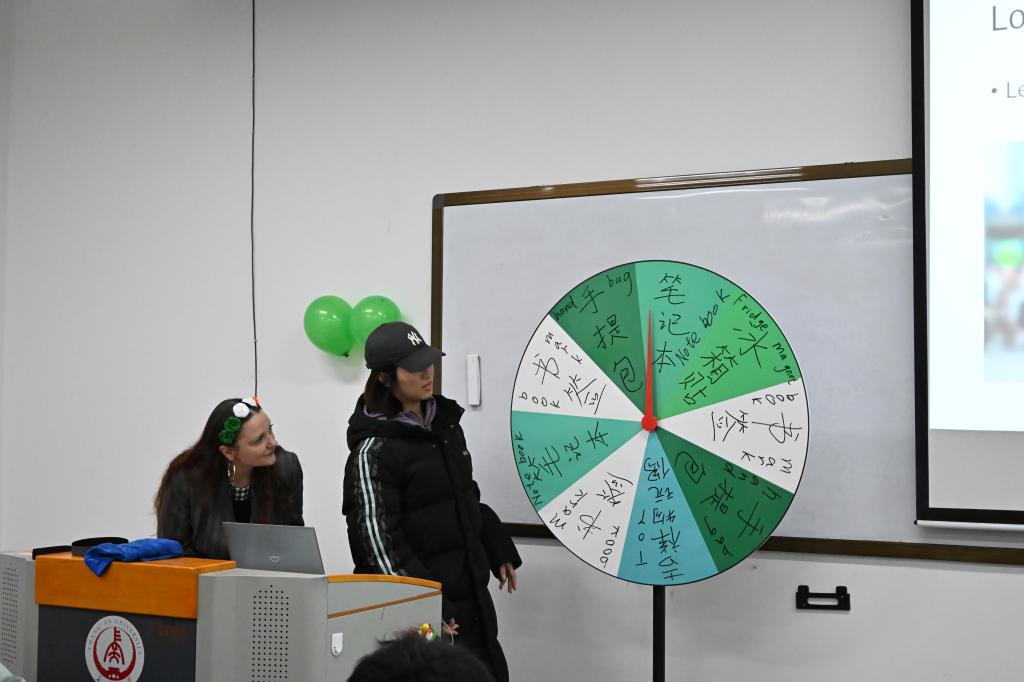 Julia现场抽取幸运观众,并送出精心准备的爱尔兰主题礼品。惊喜不断的抽奖环节将现场气氛推向高潮,欢呼声与掌声此起彼伏,大家在轻松愉快的互动中收获了节日的喜悦,也让整场活动更添温馨与欢乐。