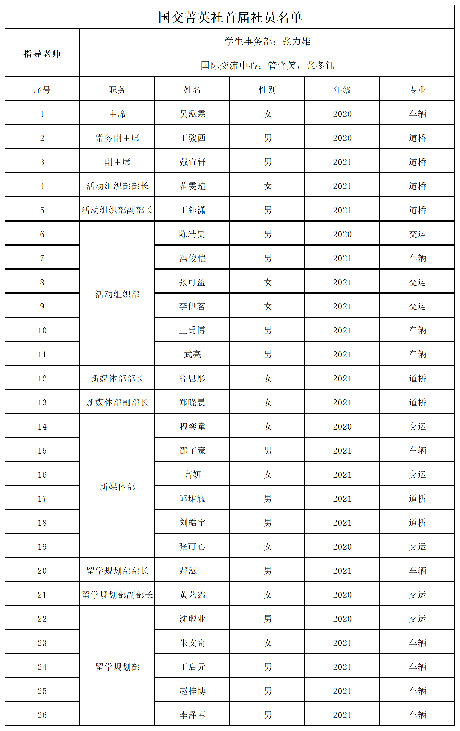 国际交流 主页 - 国际交流 - 正文 24直播网 -国际交流协会第一届纳新结果公示 浏览量:时间:2022-06-07 在24直播网 领导的指导与支持下,本着“公平、公正、公开”的原则,经过线上报名、组织审核、现场面试和集体讨论等环节,国际交通24直播网 国际交流协会(国交菁英社)首届社团成员纳新工作顺利完成,现将纳新名单公示如下: 公示时间:2022年6月7日--6月10日 在公示期内,如对结果有异议,可向24直播网 国际交流中心反映。 电话:029-61106829 24直播网 2022年6月7日