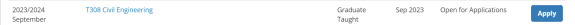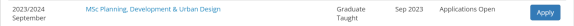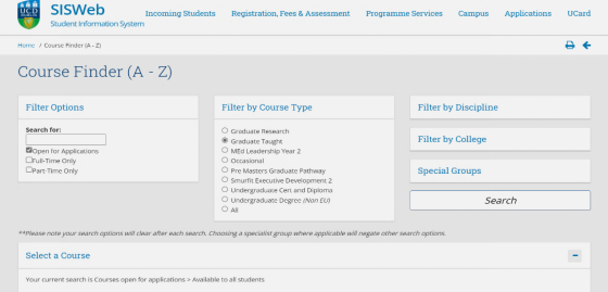 3. 选择上图Course板块下方的Select a course选课页面选择课程:一定要注意申请的项目是授课型硕士(graduate taught)还是研究型硕士(graduate research)。建议同学们申请授课型硕士(graduate taught),授课型硕士是Full time的课程,适合所有国际学生申请。研究型硕士大部分是Part time的课程,是申请不到爱尔兰学生签证的。