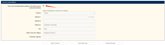 通讯地址信息,一般可以勾选和家庭地址一致,则会生成与上述表格相同的信息,之后点击Proceed to Education进行学历模块