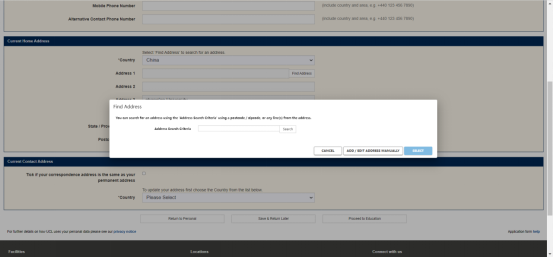 家庭住址信息:第一栏下拉选择国家China之后,会跳出地址框,点击旁边的Find Address,会跳出搜索栏,选择人工输入地址ADD/EDIT ADDRESS MANUALLY,这样就可以敲入你的地址了,输入地址完成后,选择SELECT