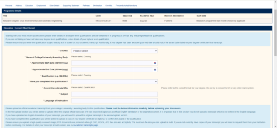 接下来填写学历模块,第一栏下拉选择国家China(如果你的学历是中国大陆的)然后再依次填写大学学校的英文名称、入学时间、预计毕业时间、学位名称、是否完成学业、GPA或者均分、专业名称、授课语言。