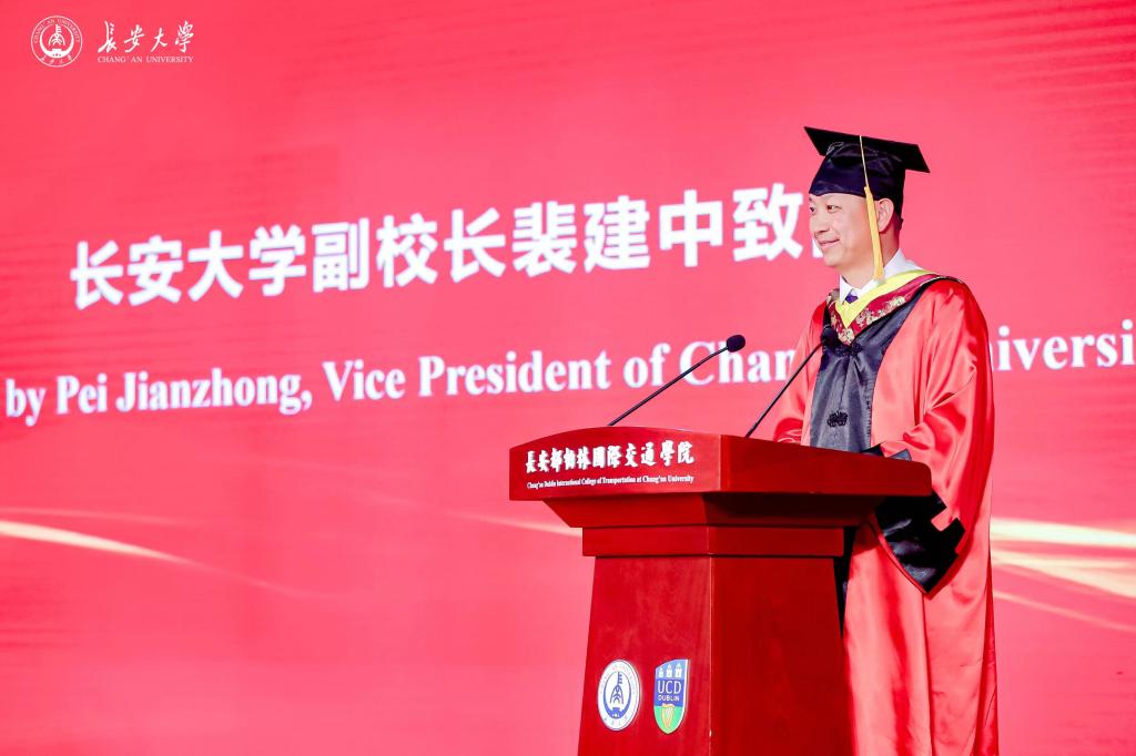 裴建中副校长代表学校向顺利完成学业的同学们表示热烈的祝贺。他表示,2019级同学们在长大度过了收获和成长的四载时光,圆满完成了厚积薄发、拔节孕穗的华丽转变。作为长安大学与都柏林大学合作开设的本科双学士学位项目的毕业生,不仅是长安大学教育国际化的参与者,也是两校深度合作的实践者,更是中爱友好关系的发扬者。临别之际,他向同学们提出三点希望:一是希望同学们厚植家国情怀,树立报国为民之志;二是希望同学们开拓全球视野,传播中国时代强音;三是希望同学们勇于创新超越,投身伟大复兴事业。