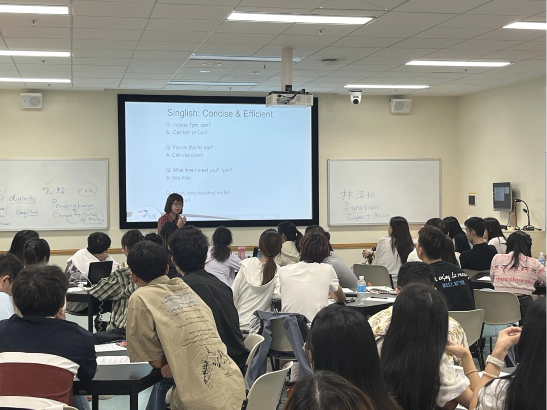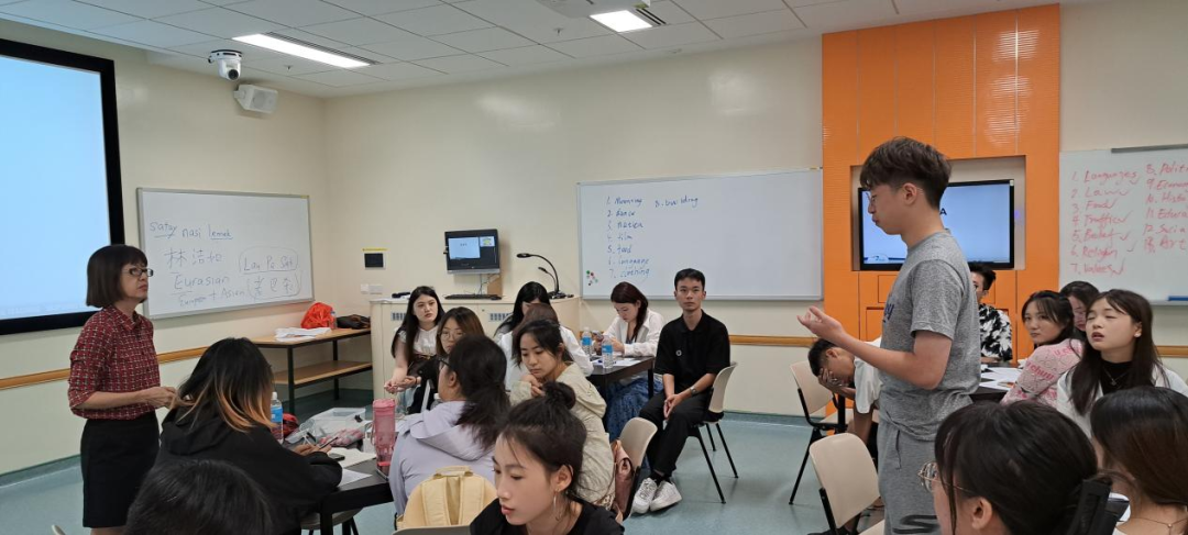 林教授由两个问题“What comes to mind when you think of the word ‘Culture’ ”和“What are the things that make the culture of a country”将同学们引入核心主题,采用小组合作形式探讨开放性问题,培养同学们的思辩能力。林教授详细介绍了新加坡是一个拥有多元文化的国家,包括华人、马来人、印度人和其他少数民族的文化,从文化背景,到融合,再到发展,其魅力在于多元文化的共存与融合;特别涉及新加坡推行的独特双语教学模式,让英语在新加坡发展出了专属特点,称为“Singlish”,即“新加坡英语”,比如不一样的发音、出现新的单词等,充分调动起大家的积极性,让同学们收获颇丰,受益匪浅。