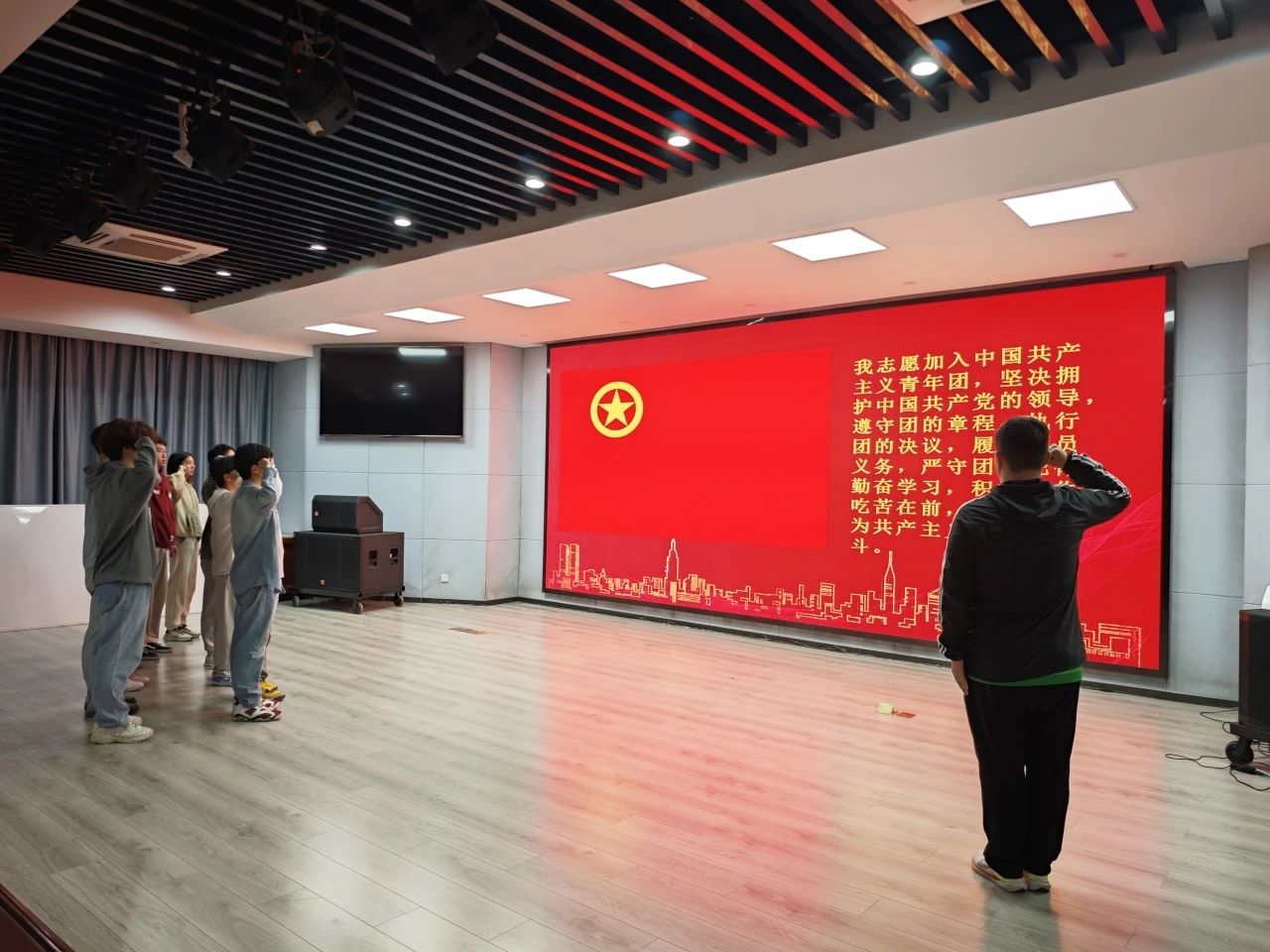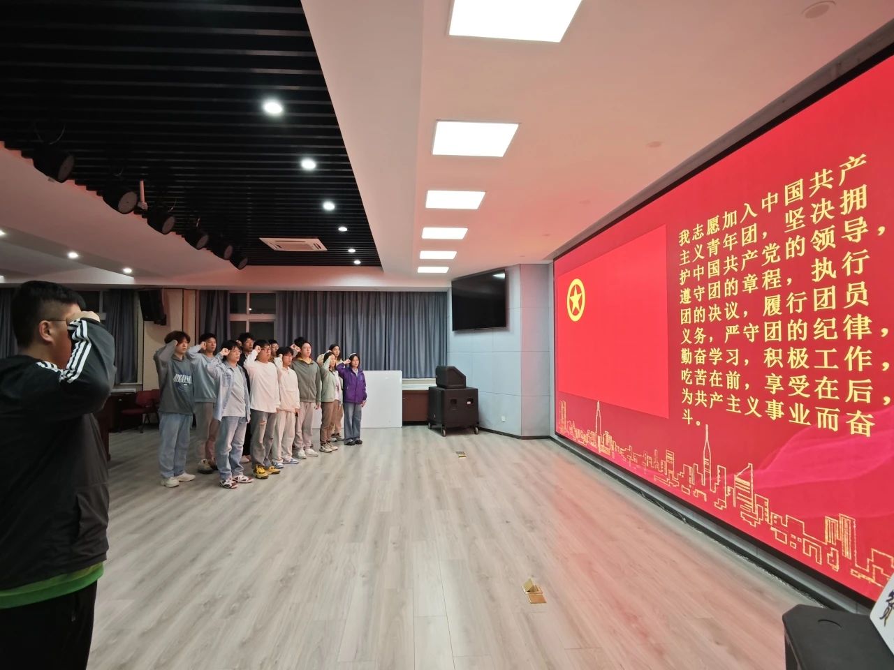 张力雄老师领学了五四精神“爱国、进步、民主、科学”的核心内涵,并分享了《人民日报》关于五四青年节的社论。通过阐述五四精神的时代价值,鼓励同学们要将五四精神内化于心、外化于行,为实现民族复兴贡献自己的力量。活动最后,同学们共同重温入团誓词。面对团旗,同学们庄严宣誓,表达了对五四精神的传承和对团员身份的坚定承诺。