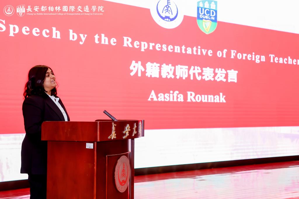 中方教师代表李锦、外籍教师代表Aasifa Rounak在发言中鼓励全体同学努力学习,克服挑战,培养独立思考和解决问题的能力。