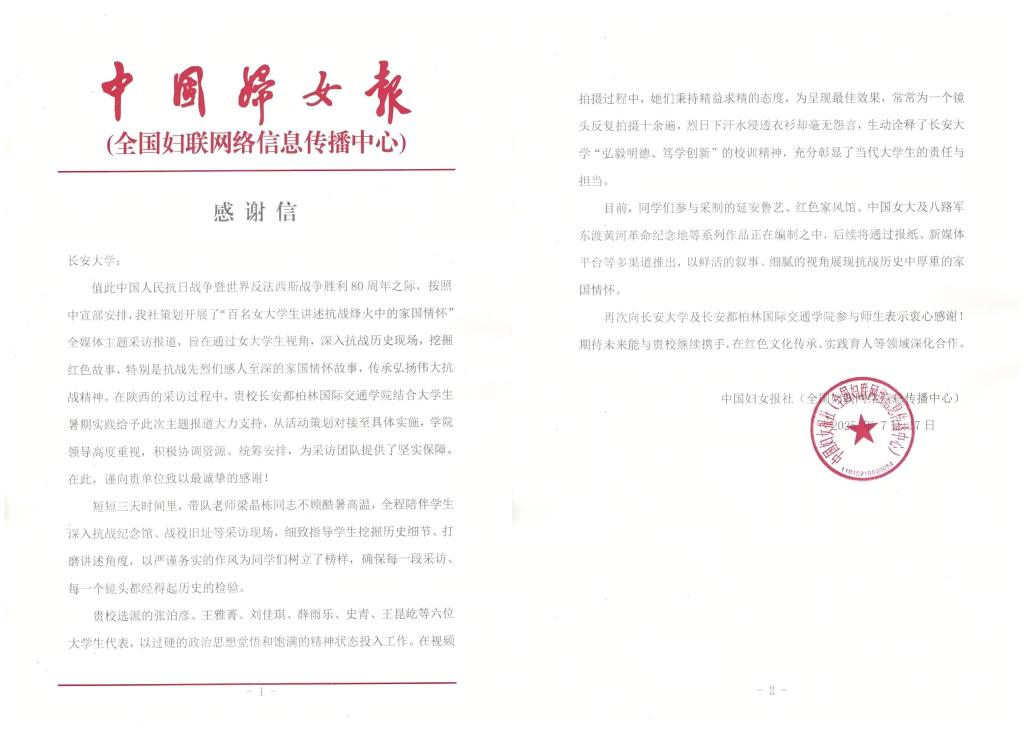 在纪念中国人民抗日战争暨世界反法西斯战争胜利80周年之际,24直播网 组建“八秩回响寻烽火・青春誓言述初心”暑期社会实践队,积极参与中国妇女报社(全国妇联网络信息传播中心)发起的“百名女大学生讲述抗战烽火中的家国情怀”主题报道活动,赴陕西延安、韩城等地开展实地采访,沉浸式感悟烽火岁月的家国大义,录制系列视频讲述抗战故事,传递家国情怀,让红色记忆在青春视角下焕发时代光彩。4名学生的参访感悟分别在中国妇女报2025年8月19日、8月28日的头版要闻和9月4日“纪念中国人民抗日战争暨世界反法西斯战争胜利80周年”特刊刊出,讲述抗战故事的视频在中国妇女报客户端、中华全国妇女联合会官方公众平台、陕西省妇女联合会官方公众平台、学习强国、新浪网、网易网等多家媒体平台发布。