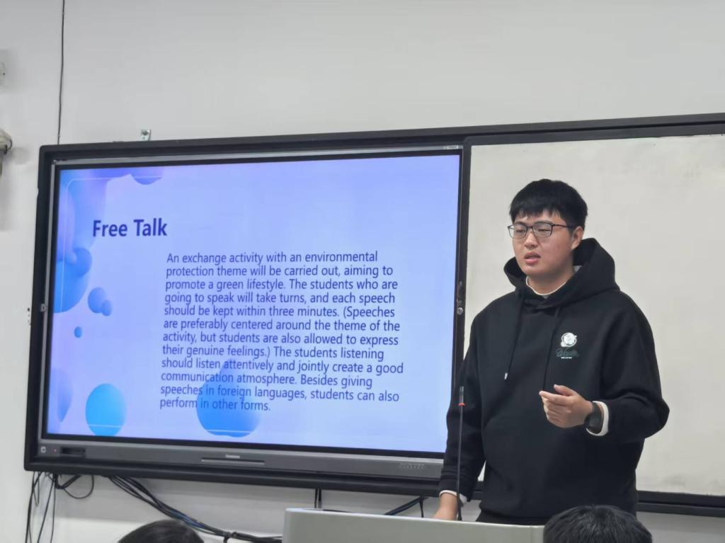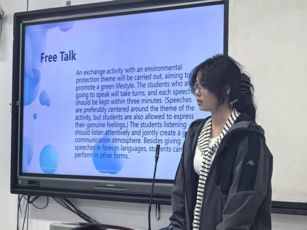 在“Free Talk”环节中,同学们围绕“绿色生活”这一主题展开讨论。大家踊跃发言,话题逐步深入。来自不同国家的同学分享了各自文化中的环保习惯,并就如何从身边小事做起来保护环境提出了建议。现场交谈声、笑声与掌声此起彼伏,气氛热烈融洽。