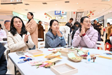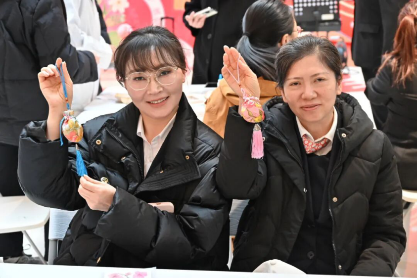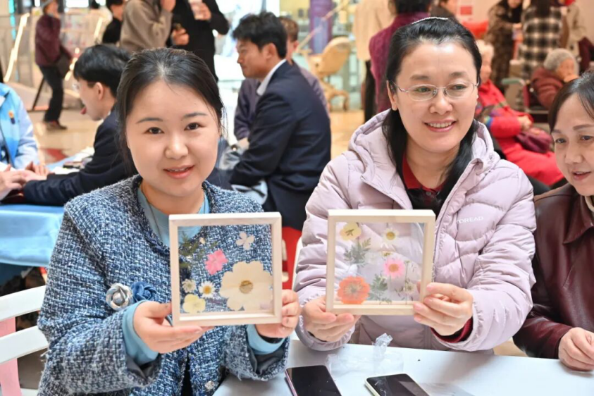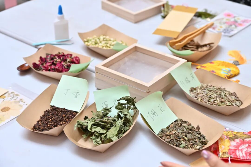 志愿者细致讲解药材功效与制作技巧,女性朋友们发挥创意,将心意缝进香囊、将美好定格在压花作品中。