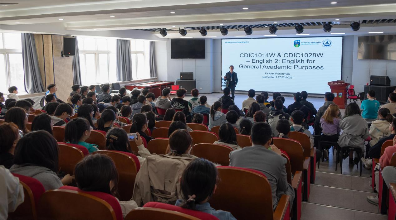 2022级与2021级全体学生参加会议,见面会由都柏林大学英语语言中心督导Alex Runchman主讲。