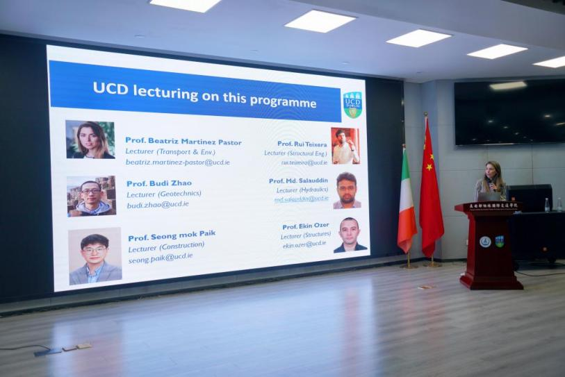 学习表示衷心祝贺。随后,她为同学们介绍了都柏林大学道路桥梁与渡河工程专业的发展历史、学科优势、专业前景、师资队伍、培养目标等相关信息。她指出,道路桥梁与渡河工程(中外合作办学)专业依托长安大学道路桥梁与渡河工程专业与都柏林大学土木工程专业,注重基础理论与工程实践相结合,旨在培养具有扎实理论基础、专业技能和丰富实践经验的复合型国际人才。Beatriz 还为2023级新生着重介绍了专业主干课程的相关内容。主干课程包括:工程地质、道路勘测设计、测量学、道路工程材料、路基路面工程等中方课程,以及建筑信息模型、桥梁工程、土木工程系统、岩土工程、工程建设管理等外方课程。此外,Beatriz 指出,本专业也为学生提供多种出国交流学习的机会,如寒暑假海外研学项目、国外工程项目实习等。她鼓励大家充分利用学习资源,打好英语基础,注重专业知识、实践能力和国际视野并重,全方位提升综合素质及核心竞争力。最后,Beatriz就2023级道路桥梁与渡河工程专业新生提出的专业课程安排、英语语言要求、出国深造、就业方向等相关问题一一作答。