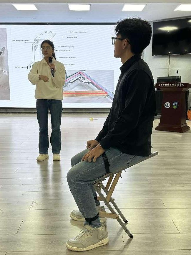 接下来,第二组展示的作品名为“机械外骨骼椅子”。设计团队将机械外骨骼概念与传统座椅设计相结合,结合人体工程学原理,采用可调节的机械结构优化用户体验。通过仿真软件验证模型的各项参数,其科学性与实用性得到了评委们一致认可。