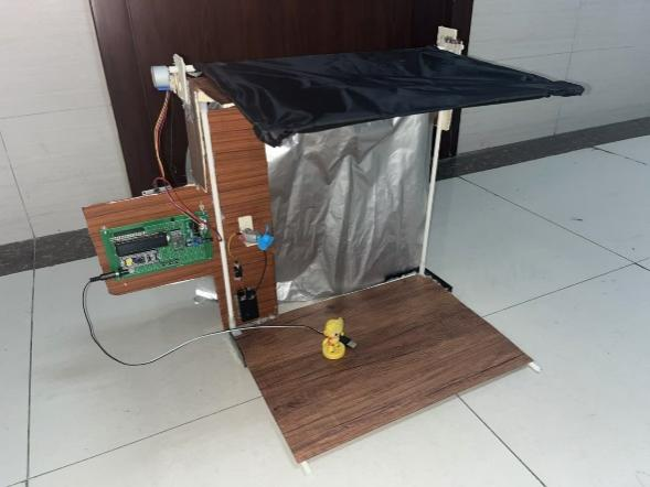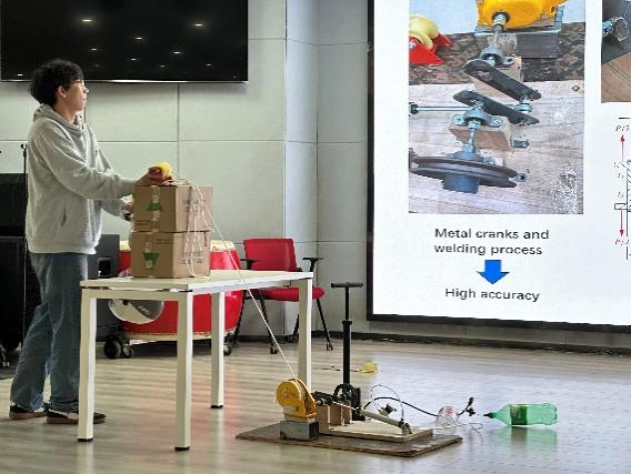 最后展示的答辩作品是“自动遮阳伞”。设计团队将光感传感器、雨滴传感器和旋转装置集成到伞体结构中,使其能够根据光线强度和天气条件自动调整伞面的开合角度以及旋转方向,提供最佳的遮阳避雨效果。现场通过模拟光照以及下雨环测试了自动遮阳伞的功能,生动展现出了智能化机械设计在日常生活中的巧妙应用。