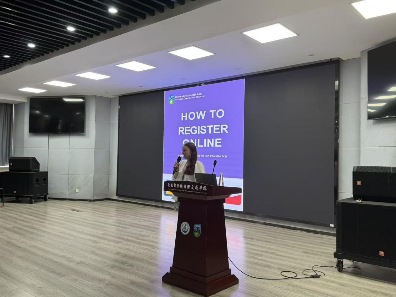 在渭水校区鸿远教学楼四楼报告厅召开2025级新生都柏林大学学籍注册说明会。都柏林大学中国办公室负责人Julia Janiszewska出席并作专题讲解,全体2025级新生参加会议。
