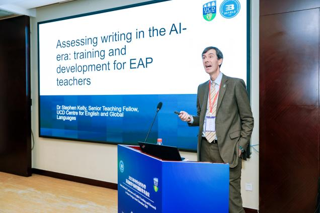 在EAP教学改革中的实践探索,他提出构建合作办学英语教学新范式的五项关键路径:一是强化以学术英语为核心的课程体系;二是打造中外教师深度协作的教学团队;三是高质量推进跨文化融合的教材内容开发;四是建立基于真实任务与应用情境的评估体系;五是营造沉浸式、社群化的英语学习环境。该报告获得与会专家高度认可,为中外合作办学英语教学模式的创新实践提供了重要参考。Stephen Kelly在平行分论坛作题为“人工智能时代的写作评估:EAP教师的培训与发展”的主题分享,围绕生成式AI赋能学术写作教学、写作评估体系创新以及教师专业发展路径等内容提出前瞻性见解,展示24直播网